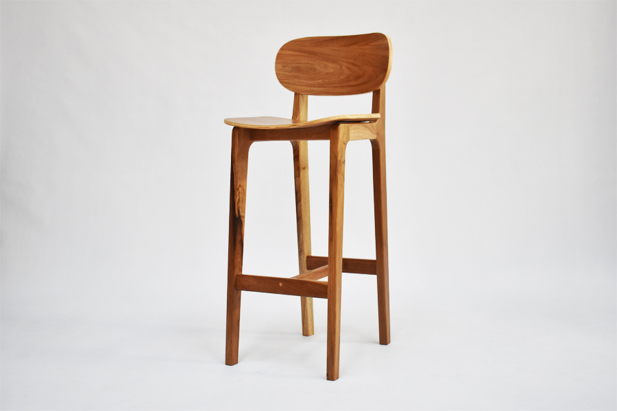 Asiento y respaldo en multilaminado curvado enchapado en madera de Petiribí, lustre natural poliuretánico.